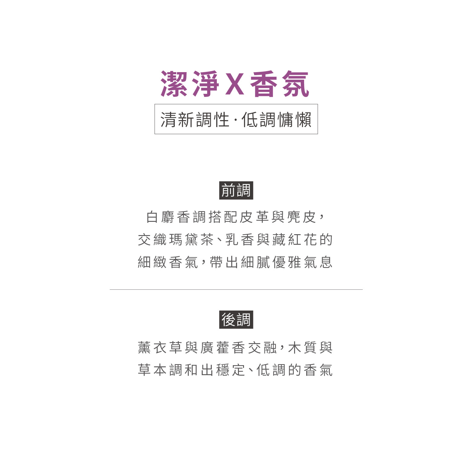 富含維他命E來源的生育酚,提升肌膚滋潤度,使用後膚觸柔滑細緻。薰衣草與廣藿香調和,清新柔和,為日常清潔增添沉靜與安心感。