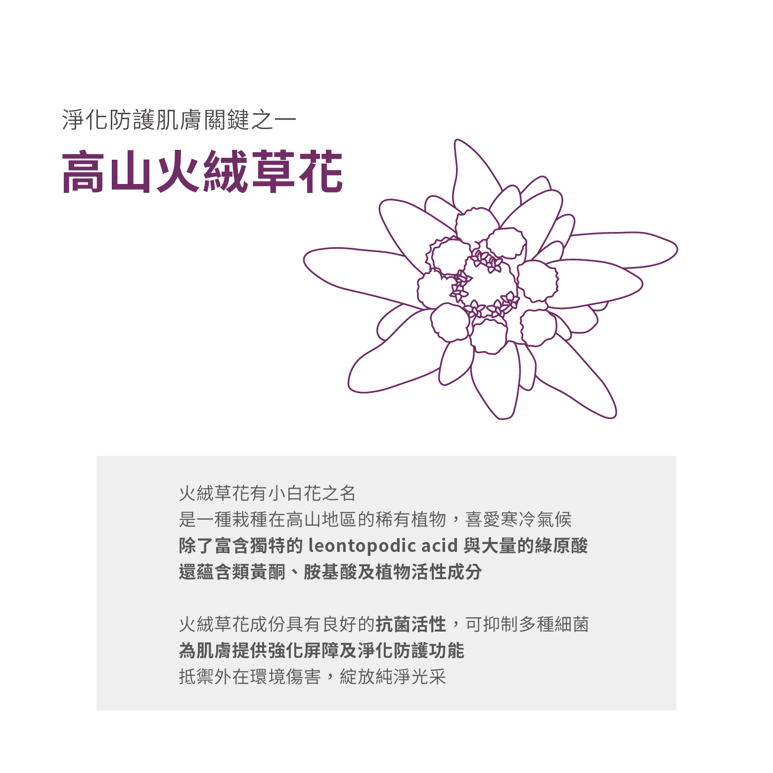 添加高山火絨草花萃取,為肌膚帶來舒適防護感,適合在環境變化大時使用。